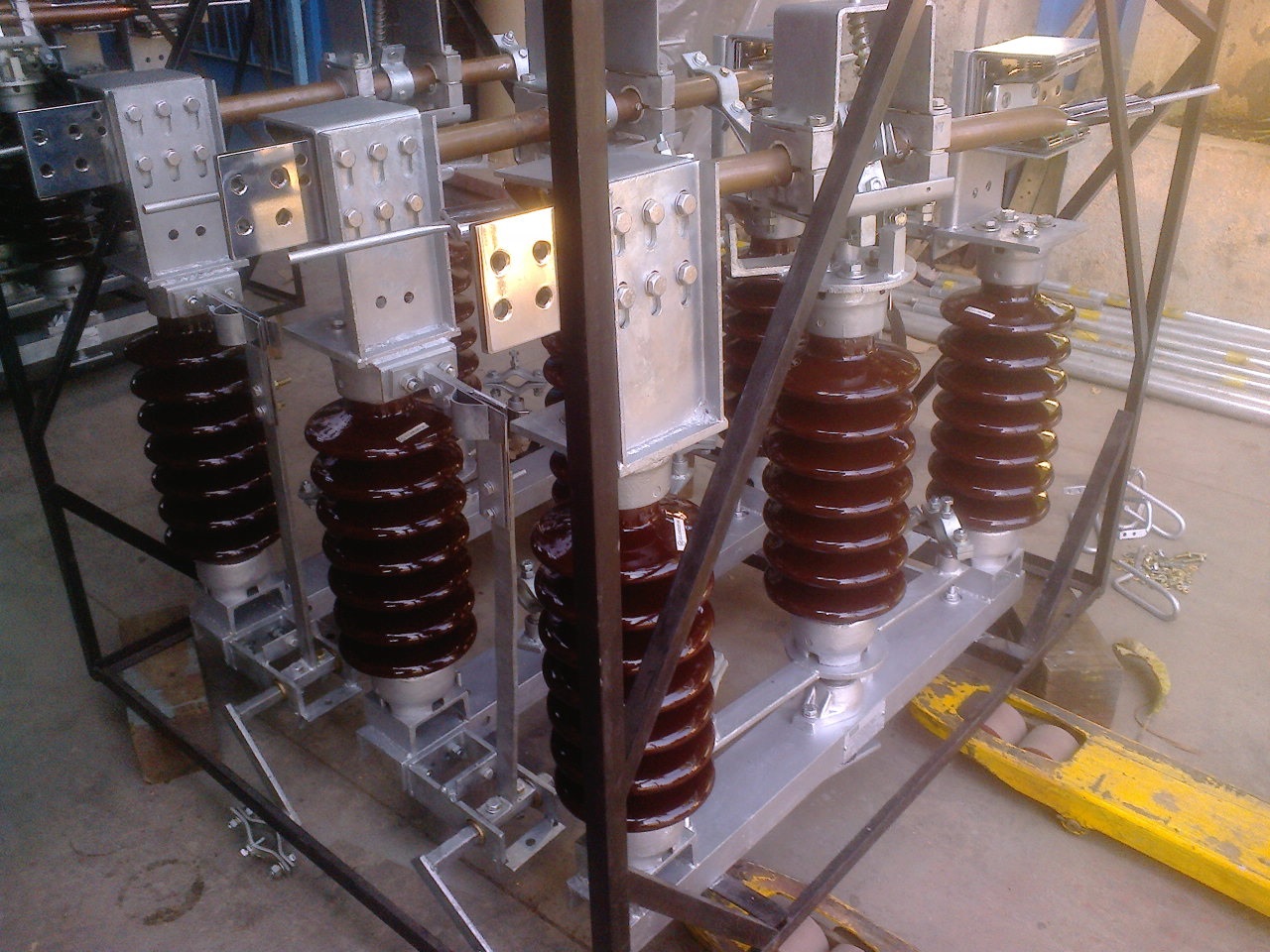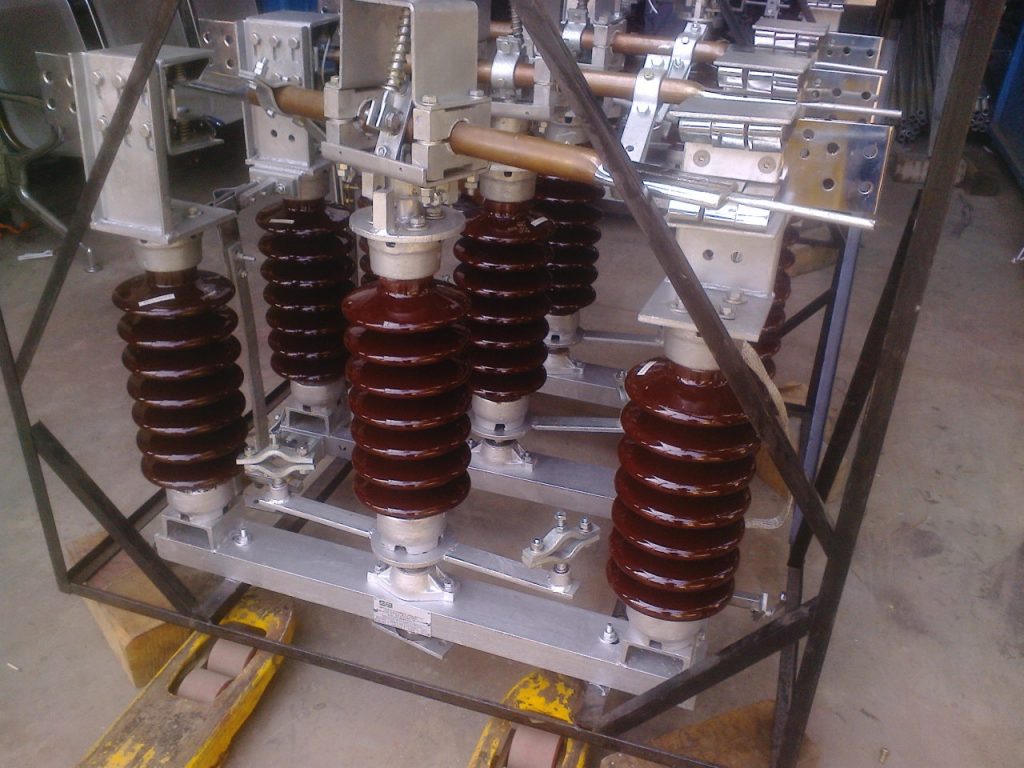 We manufacture Offload Onload isolators Gang operated Outdoor up to 66kV 1600A 31.5kA/3sec..We can provide with and without earth switch..Double break single break both..Air break switches also we provide..The isolators come with a support structure..